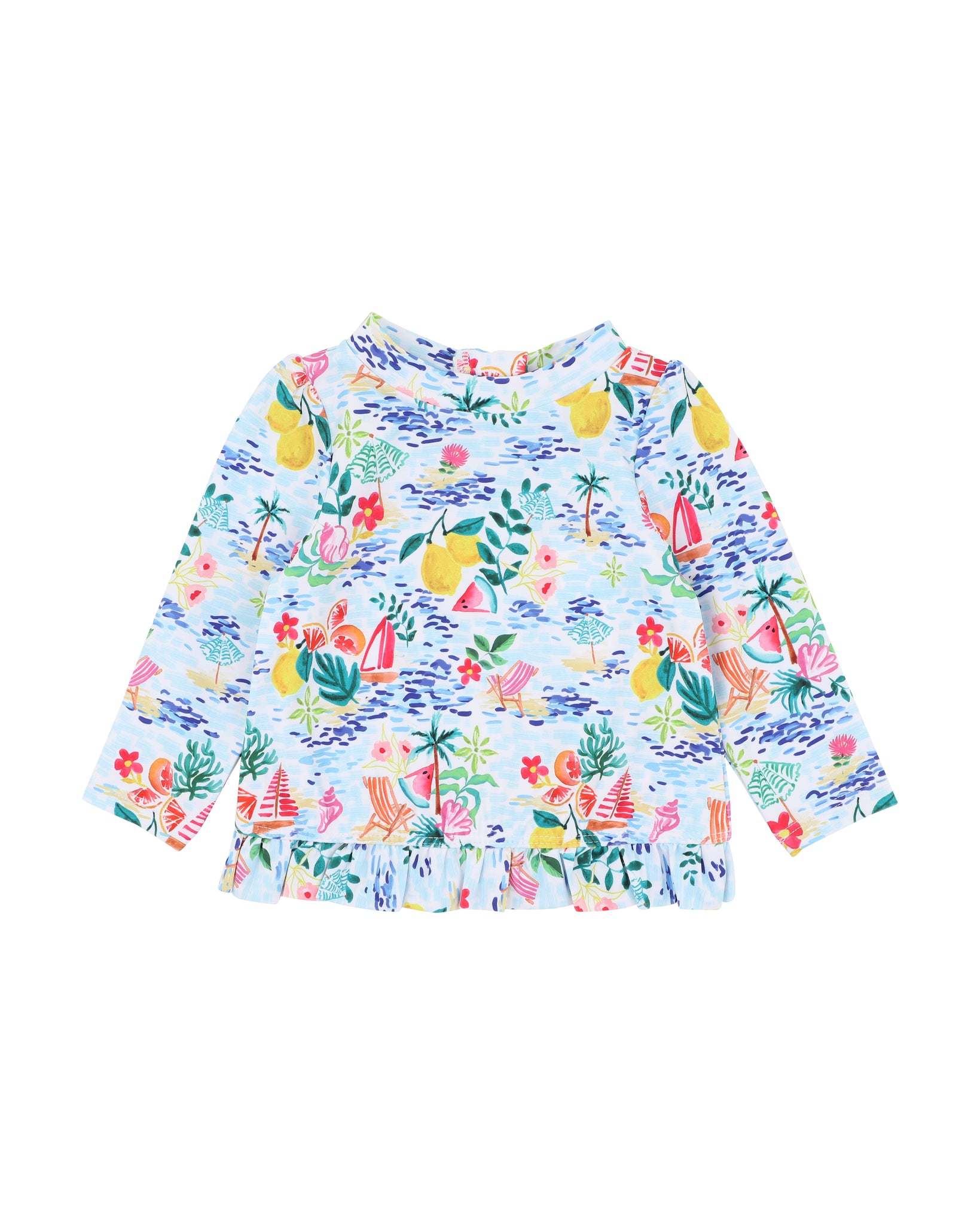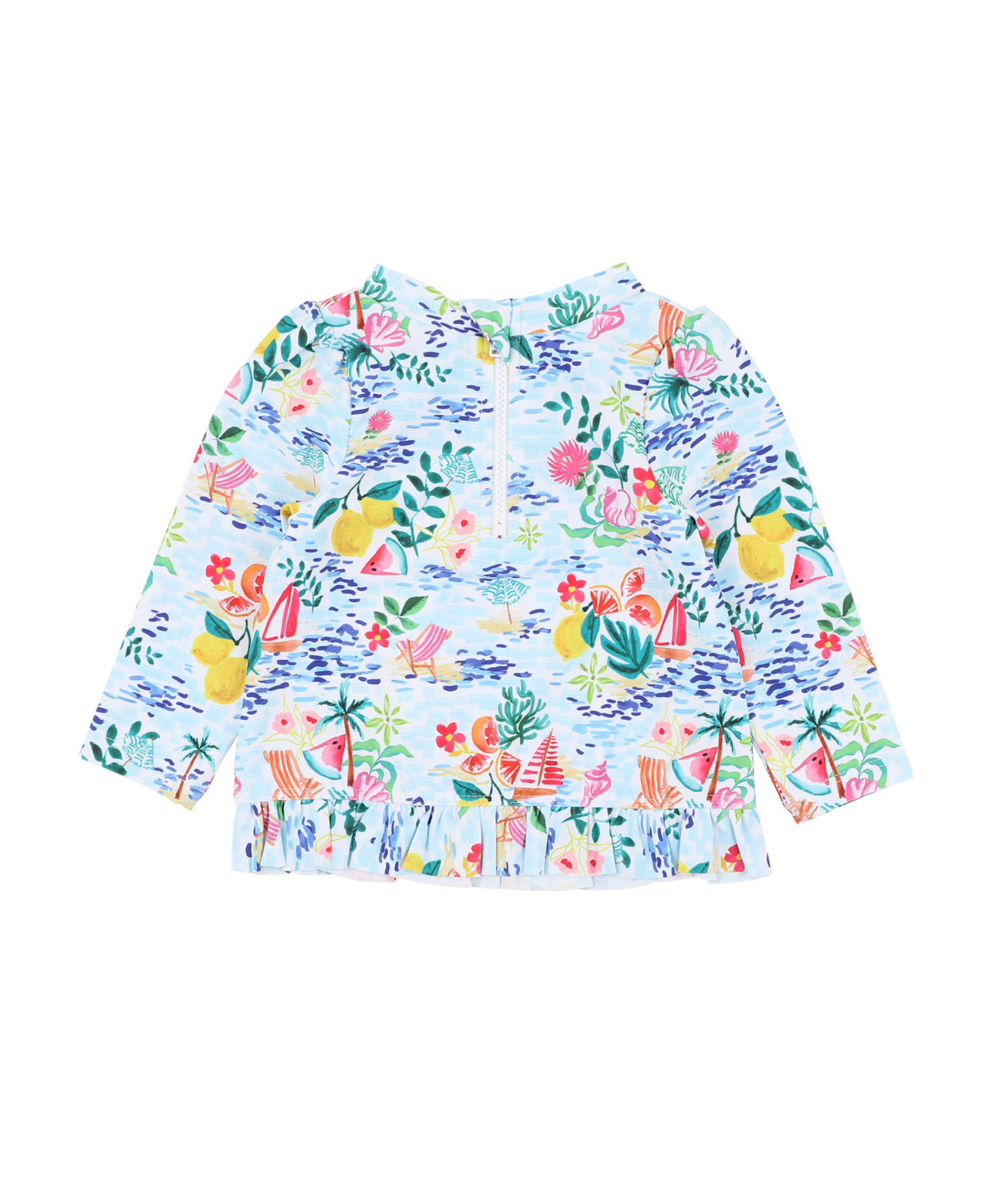 Keep little ones covered in style with this long sleeve swim top. Featuring a cheerful Amalfi inspired print with beach scenes, fruits and florals and sweet frill hem, it's designed for fun in the sun with a centre back zip for easy changes.