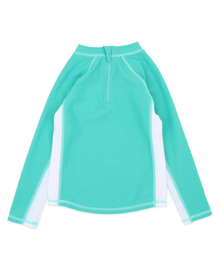 A fresh take on sun-smart style, this teal green long sleeve rash top is designed to move with them through every swim, splash, and dive. With bold white side panels and a sun-inspired chest print that reads Summer Paradiso, it's the perfect layer for long days in and out of the water. Pair it back with the Luca stripe boardshorts for a head-to-toe coastal look.