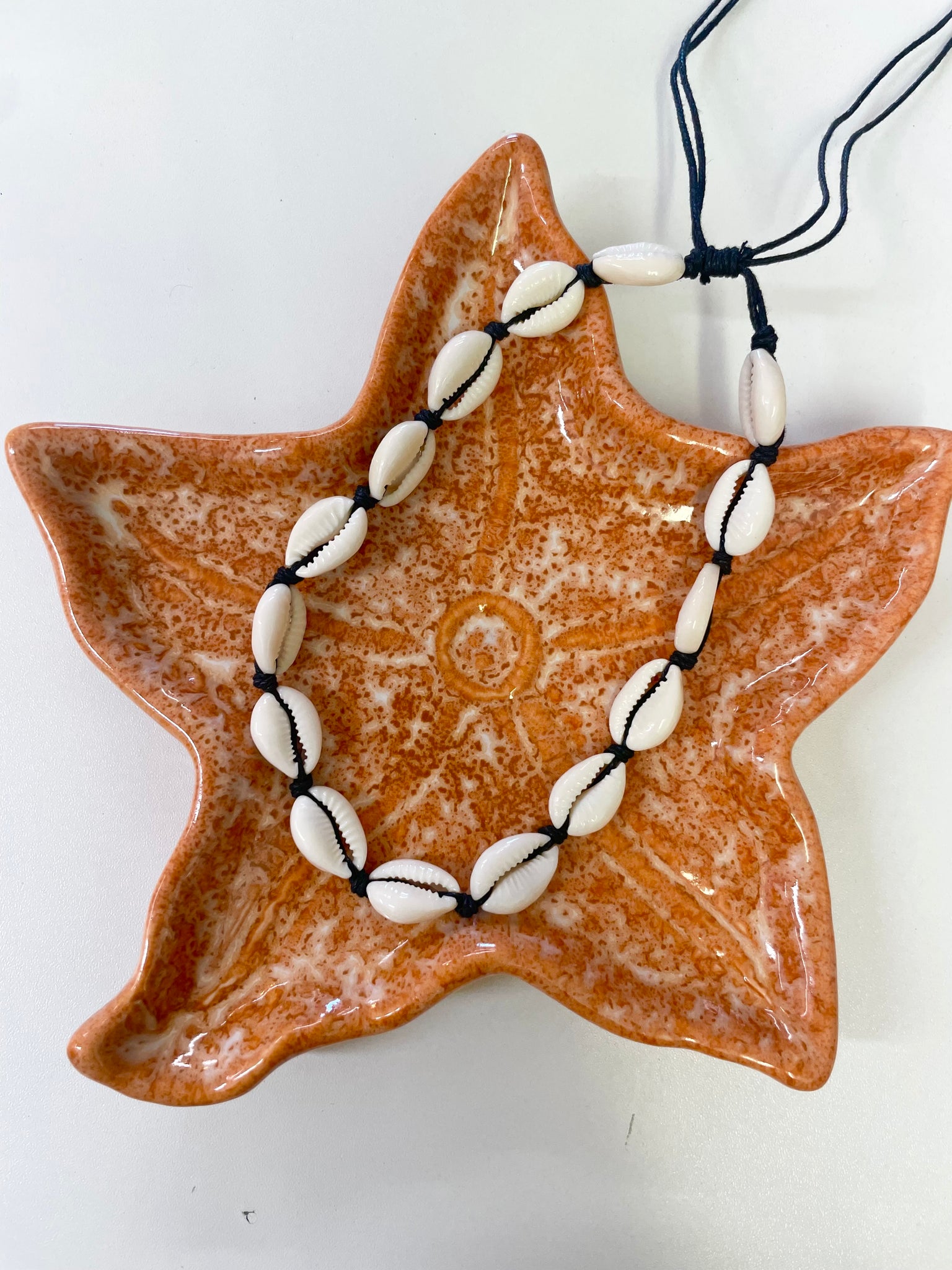 Cord necklace with multiple cowrie shells. Length is adjustable.