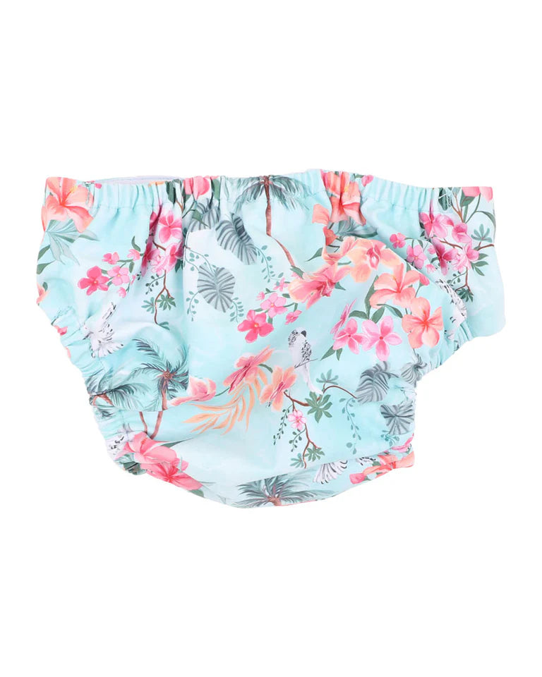 Whether it's her first splash or her hundredth paddle, this cheerful aqua nappy in our blue tropical print is made for sunny days and salty toes. With sweet little birds perched among tropical palms and hibiscus blooms, it's a playful pick for poolside fun.