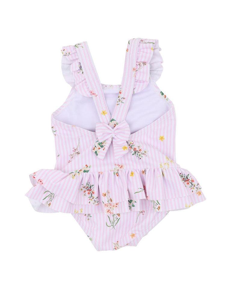 A garden of soft pink stripes and floral sprigs brings this one-piece to life-just made for seaside wanders and splashy play. With frilly shoulder straps, layered ruffles at the waist and a sweet bow at the back, it's perfect for little swimmers who love a bit of flair with their fun. Designed for comfort, movement and extra sun protection, this is a summer essential you'll reach for again and again.