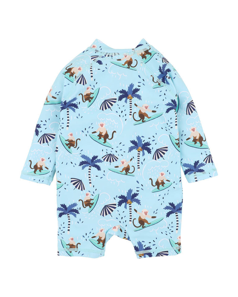 Made for sun-filled beach days and seaside adventures, this long sleeve rash suit features our cheeky monkey surf print on a tropical blue base. With palm trees, waves, and parasols scattered throughout, it's a fun and functional piece that offers plenty of coverage for little ones on the move. A front zip allows for easy changes after a splash in the waves.